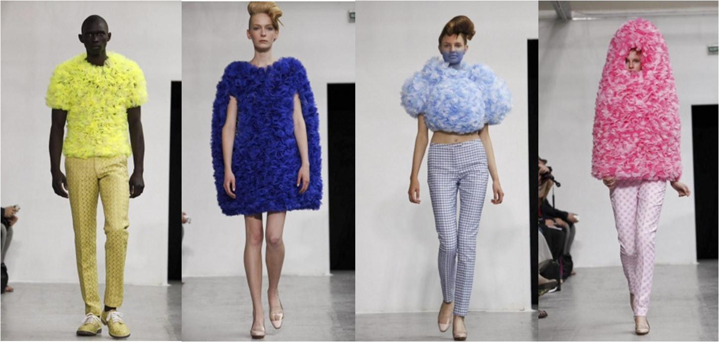 If you ever wondered what it would be like to experience the cross-section of Wonderland and Sweeney Todd’s barber shop sans mind-altering substances, Walter Van Beirendonck has your answer. His show was a plucky explosion of brightly colored mismatched patterns, and, shall we say, garden-inspired pieces. That’s the Alice-side of things. Then you’ve got the shredded tops, ghastly face paint, and bouffants accessorized with combs to complete the imagery. Bizarre though it was, his show played out like the fashion version of a half-hour comedy, milking laughter – or something like it – with the absurdities of his designs.